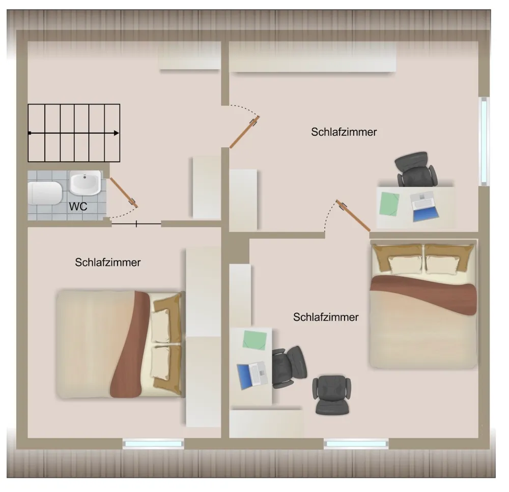 Das Obergeschoss umfasst drei Schlafzimmer sowie ein zusätzliches Gäste-WC mit Tageslicht.