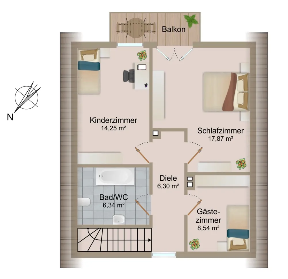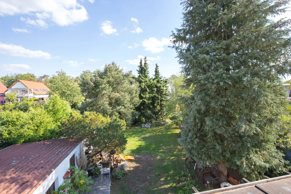 Im Obergeschoss blicken zwei Zimmer nach hinten auf den Garten und haben einen Zugang zum Balkon des Hauses. Ein etwas kleinerer Raum und ein Wannenbad mit WC komplettieren diese Etage.